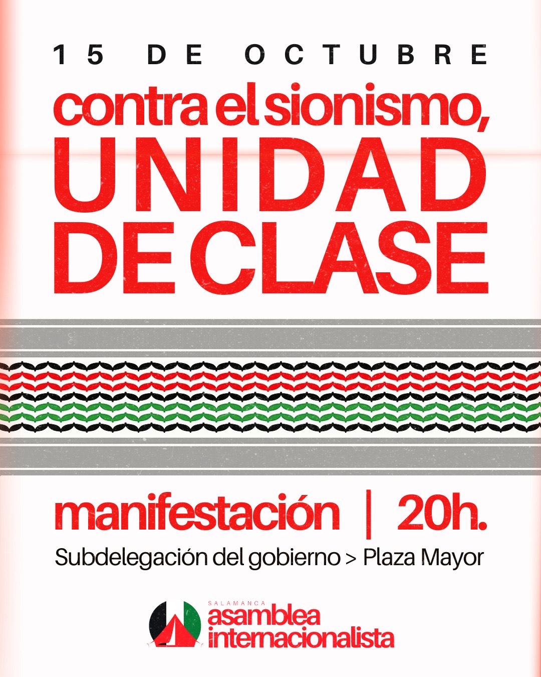 –20:00 Manifestación unitaria, “Frente al sionismo, unidad de clase”. Desde la Subdelegación de Gobierno hasta la Plaza Mayor.